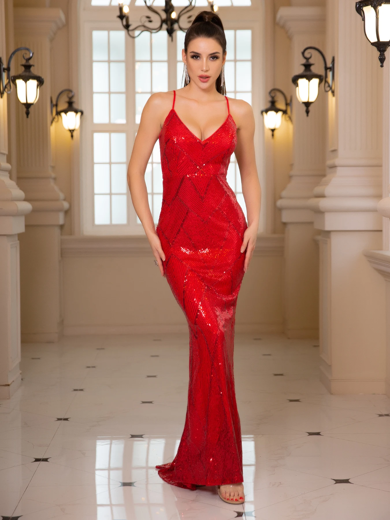 KIM - Robes de soirée de mariage col en V paillettes extensibles bretelles spaghetti robe de soirée formelle dos nu robe de bal 2025